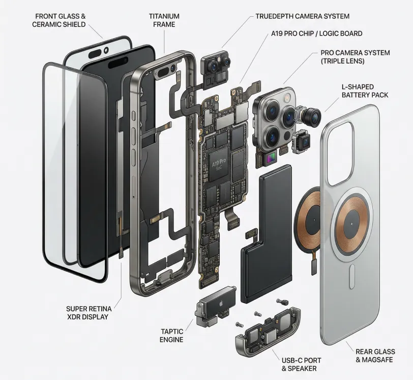 product design, {argument name="item" default=iphone17"}, exploded view diagram, white background, three-dimensional, highly detailed internal components, studio lighting, product photography, best quality