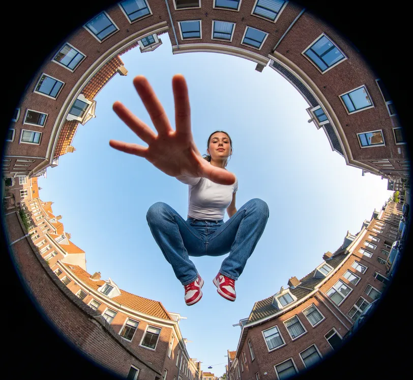 Make an Ultra-wide fisheye lens perspective shot from ground level looking straight up at a young woman use image for face reference crouching mid-air between brick buildings forming a circular frame around the sky. She reaches one hand dramatically toward the camera, fingers spread wide, creating strong foreground distortion and depth. Dynamic action pose, confident expression, casual streetwear outfit: fitted white t-shirt, blue straight-leg jeans, red and white sneakers. Urban European neighborhood setting with brick houses, tiled roofs, windows visible around the edges. Bright daylight, clear blue sky, natural lighting, sharp focus, high detail, cinematic composition, exaggerated perspective, 8k resolution, photorealistic, adventure photography style.
