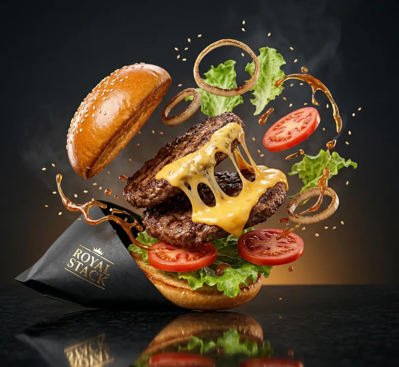 Photorealistic luxury burger ad for ROYAL STACK. Glossy golden brioche bun with sesame seeds, double flame-grilled beef patties, melting aged cheddar, crisp lettuce, juicy tomato slices, caramelized onions, glossy signature sauce. Dramatic mid-air explosion freeze-frame: patties falling, cheese stretching, lettuce & tomato flying, sauce splashing in arcs, sesame seeds scattering. Hero burger centered with sharp reflection on polished black stone. Subtle gold foil ROYAL STACK logo embossed on matte black wrap. Cinematic lighting: strong rim light, bright highlights on cheese & sauce, warm grill glow, soft smoky backlight. Deep charcoal background with warm amber fade. Macro low-angle, ultra-fast shutter, shallow DOF — sharp on logo & melt, soft blur on flying bits. 8K hyper-detailed, mouthwatering premium style.Ultra-short one-liner version: ROYAL STACK gourmet burger mid-air explosion, glossy brioche, double patties, melting cheese, flying ingredients, cinematic lighting, gold logo, black stone reflection, macro low-angle, 8K photorealistic food ad.